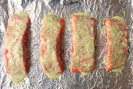 حالا با قلم روی فیله را با مخلوط خردل عسلی بپوشانید. با قلم مو روی فیله را با مخلوط خردل عسلی بپوشانید سینی را داخل فر گذاشته و ۸ تا ۱۰ دقیقه صبر کنید تا سالمون ها بپزند. اگر وسط ماهی کمی خام باشد مشکلی ندارد، زیرا بعد از بیرون آوردن از فر به خاطر حرارت بالا، قسمت های نپخته هم می پزند.